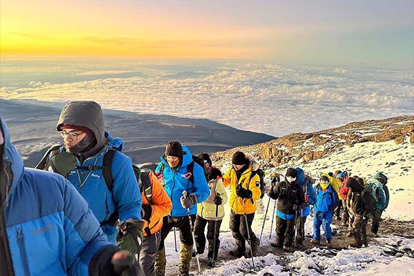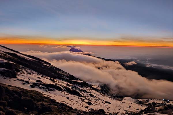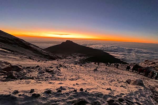 Very early in the morning (midnight to 2 am), we continue our way to the summit between the Rebmann and Ratzel glaciers. You head in a northwesterly direction and ascend through heavy scree towards Stella Point on the crater rim. This is the most mentally and physically challenging portion of the trek. At Stella Point you will stop for a short rest and will be rewarded with the most magnificent sunrise you are ever likely to see. Faster hikers may view the sunrise from the summit.