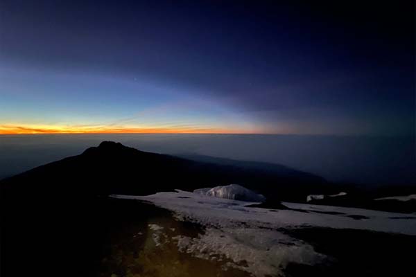 Very early in the morning (midnight to 2 am), we continue our way to the summit between the Rebmann and Ratzel glaciers. You head in a northwesterly direction and ascend through heavy scree towards Stella Point on the crater rim. This is the most mentally and physically challenging portion of the trek. At Stella Point you will stop for a short rest and will be rewarded with the most magnificent sunrise you are ever likely to see. Faster hikers may view the sunrise from the summit.
