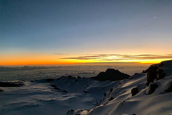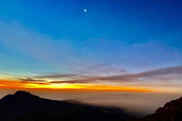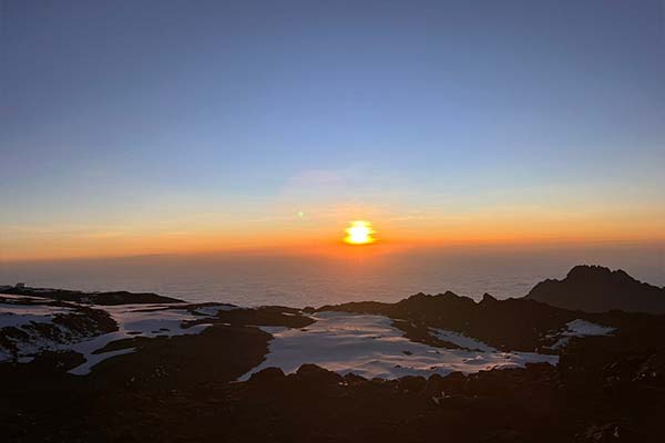The beginning of this climb is done in the dark and requires headlamps or flashlights. It will be very cold until you start descending, so you will need all of your warm layers. This is by far the most difficult part of the trek with many switchbacks. Going slowly “pole pole” and an optimistic attitude will get you there!